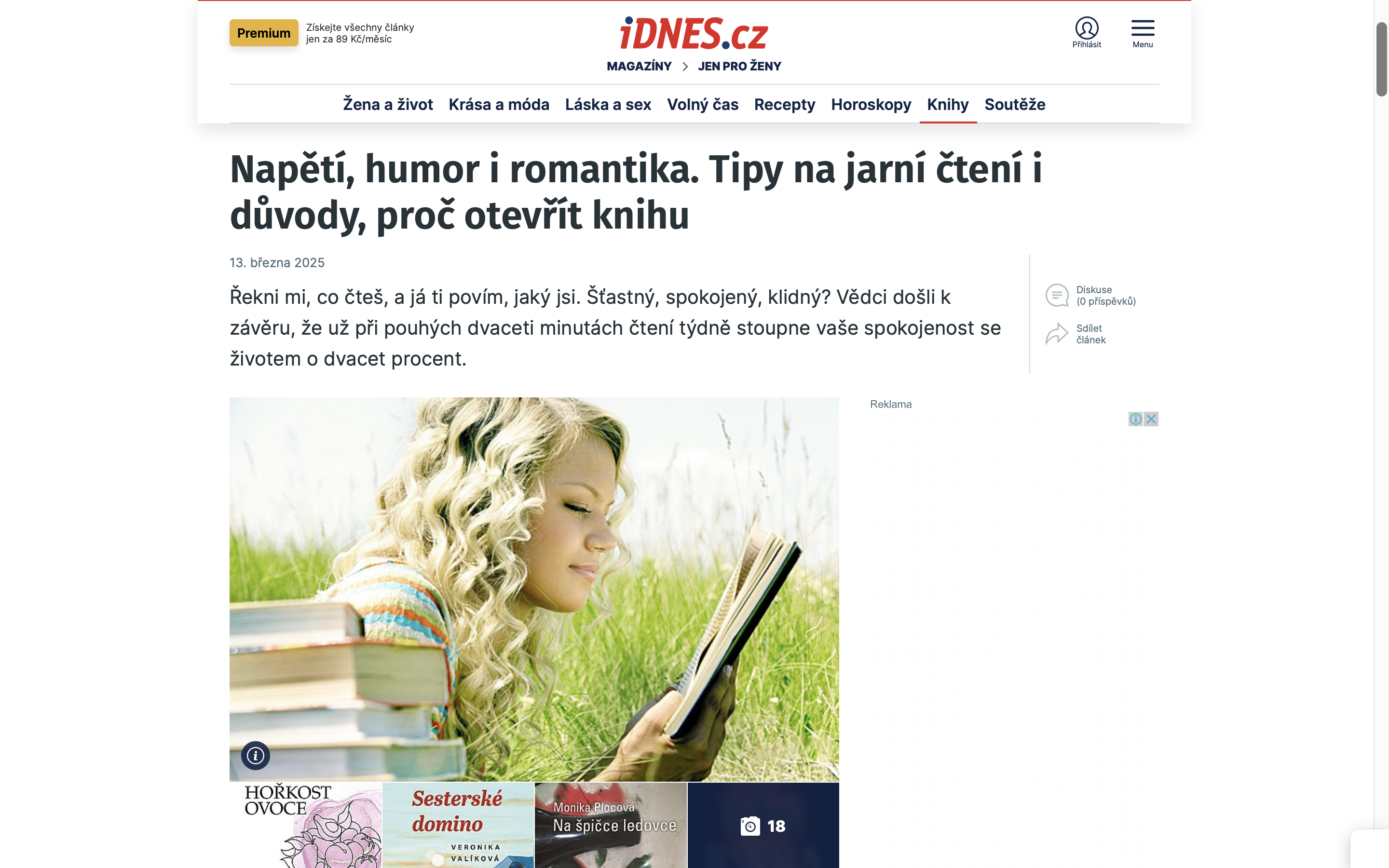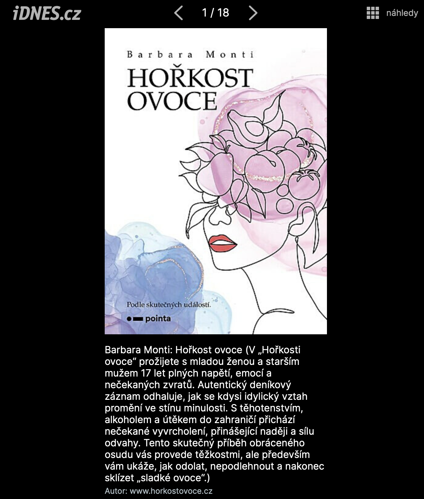 Máme obrovskou radost a chceme se o ni podělit i s vámi! 🎉 Hořkost Ovoce se objevila v článku na iDNES mezi doporučenými knihami pro jarní čtení. 💛 Je to krásné potvrzení toho, že příběh oslovuje čtenáře a nachází si své místo mezi knihami, které stojí za přečtení.